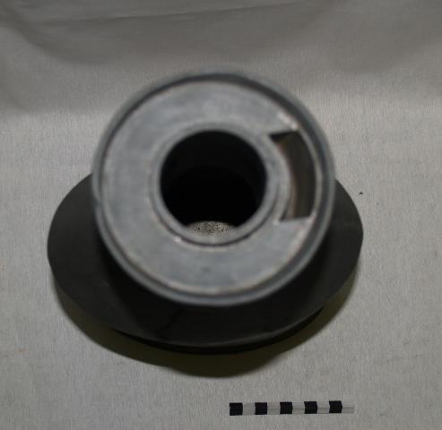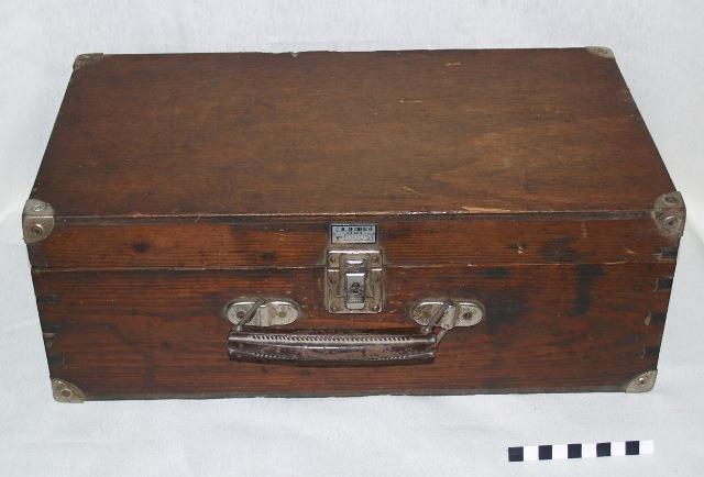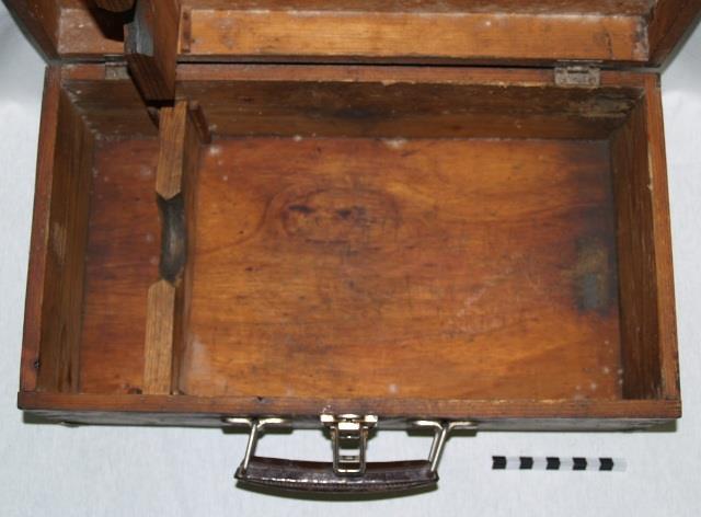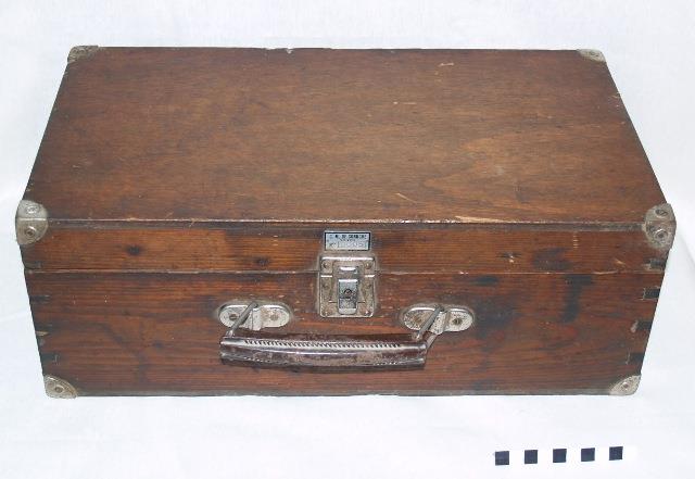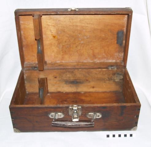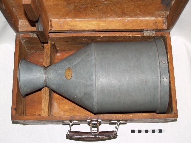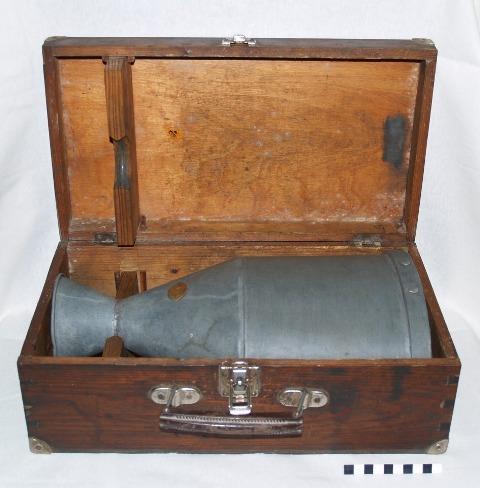 Estojo com vasilha de 5 litros para aferir as bombas de combustível de veículos automóveis. O estojo tem uma pega e um fecho. Existência de um reforço metálico nos oito cantos exteriores. Tem também uma chapa metálica com a inscrição "C M Coruche/ Património/ 0005".