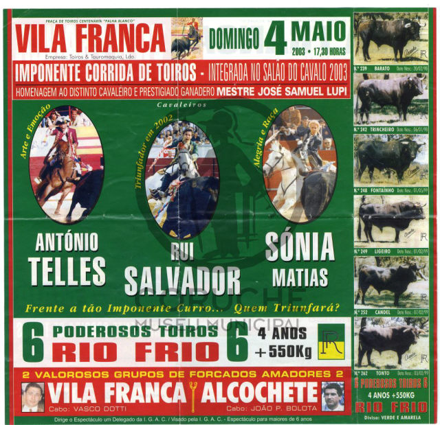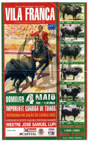 Praça: Vila Franca. 4 maio 2003. Homenagem ao cavaleiro José Samuel Lupi. Cavaleiros: António Ribeiro Telles; Rui Salvador; Sónia Matias. Forcados: Amadores dae Vila Franca; Amadores de Alcochete. Ganadaria: Rio Frio.