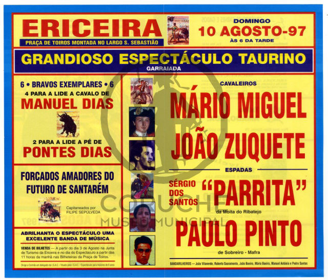 Garraiada. Praça: Ericeira. 10/08/1997. A CAVALO: Mário Miguel, João Zuquete. A PÉ: Sérgio dos Santos Parrita, Paulo Pinto; Roberto Sacramento. FORCADOS: Amadores do Futuro de Santarém (Filipe Sepúlveda). TOIROS: Manuel Dias, Pontes Dias.