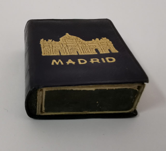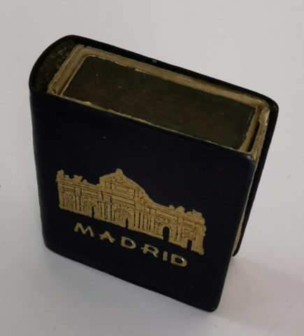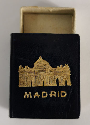 1 caixa de fósforos com formato de livro: Madrid, Puerta de Alcalá, em dourado. Coleção reunida desde meados do século XX por José Maria Rebocho (1927-1995).